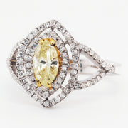 Fancy Yellow Diamond Double Halo Marquise Cocktail Ring 1.02 Tcw 18K White Gold
